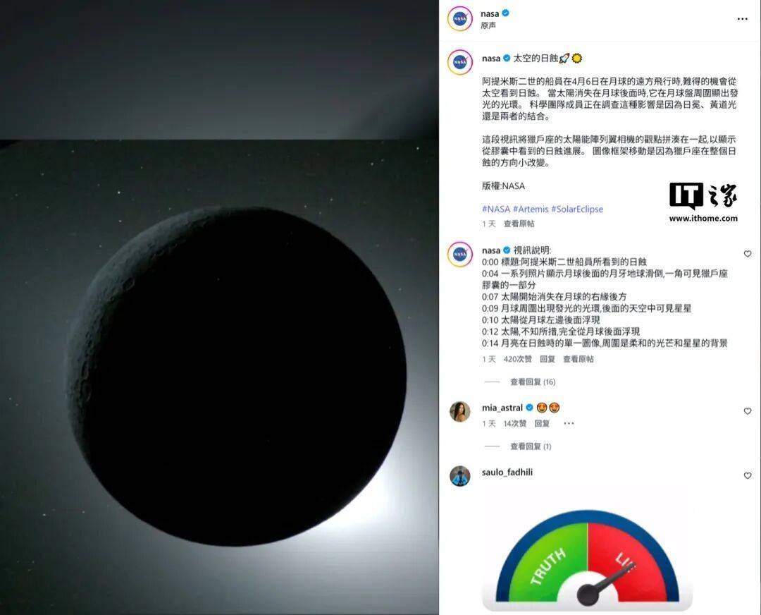 美邦宇航局 4 月 10 日正在 Instagram 上宣告延时视频,浮现了美邦载人绕月“阿尔忒弥斯 2 号”(Artemis II)职司岁月拍摄的罕睹日全食。