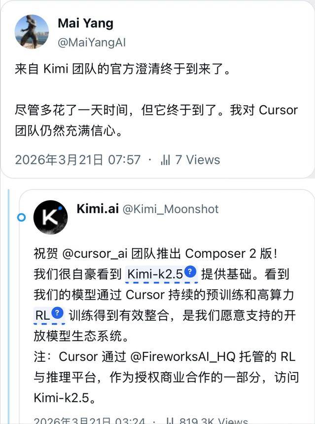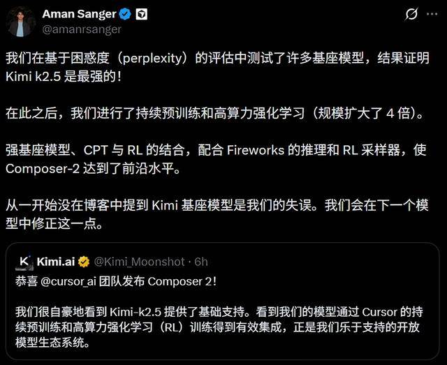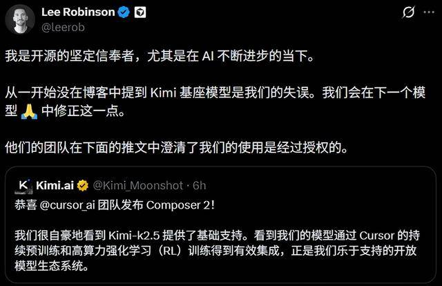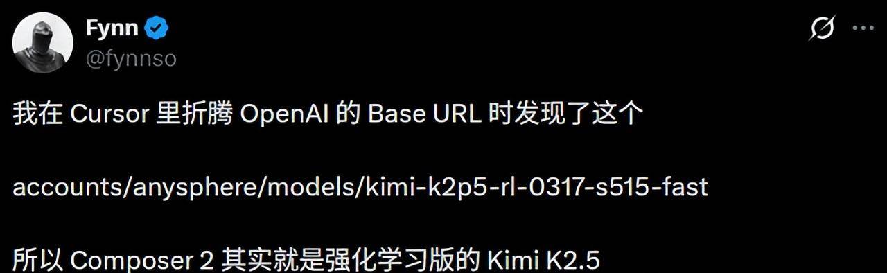 翻译过来即是,这个光环满满的Composer 2,底下跑的原本是Kimi K2.5的加强进修版本!