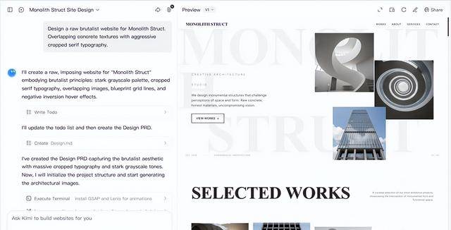 编码本领是K2.5最越过的长板,加倍是前端开荒场景。譬喻,给它一张UI打算稿,K2.5能直接输出带交互动效和滚动触发成效的完善前端代码。