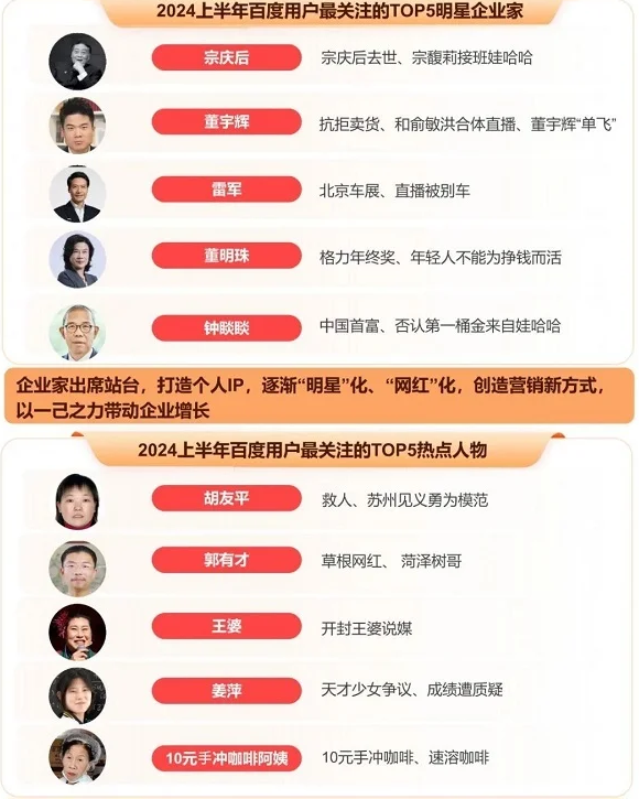 正在百度,董明珠、雷军、董宇辉等企业家出席站台,打制片面IP,逐步“明星化、网红化”,立异营销新办法,让用户得以近隔断接触企业,一己之力鼓动企业增加。与此同时,胡友平、王婆、郭有才这类“小人物大变乱”,正在百度热门的场域中具有更高的筹议热度。百度鸠集企业家与热门人物,协同绘就生存缩影。用户则看重心情共鸣,跟从企业家告成之道,醉心小人物故事。