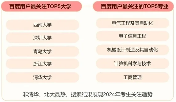 值失当心的是,百度用户最体贴的高考音讯并不单是学校的名气,院校与专业音讯成为用户的中心研讨。《陈说》显示,西南大学、深圳大学、青岛大学、浙江大学、清华大学是百度用户最体贴的TOP5大学。电气工程及主动化、电子音讯工程、呆板安排修制及其主动化、揣度机科学与技艺、工商料理则是百度用户最体贴的TOP5专业。