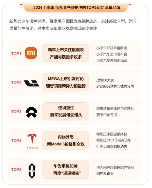 2024上半年,新能源高潮接连发酵,小米、理思、蔚来、特斯拉、华为问界成为2024上半年度用户最体贴的TOP5新能源汽车品牌。