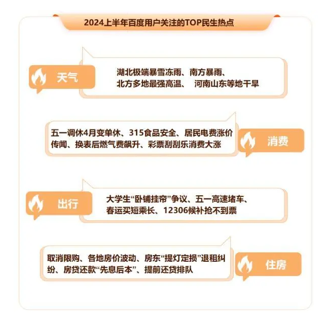 2024上半年,百度用户体贴的TOP的民生热门包罗了气候、消费、出行、住房等。百度用户心系民生热门,保留着关于社会变乱的插手热心,踊跃插手筹议,抒发本身的观念。