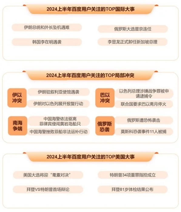 《陈说》显示,2024上半年,中邦百度用户最体贴邦际军事故乱便是美邦大选,用户关于美邦大选变乱揭示出激烈体贴,踊跃插手到热搜中并发声,主动互动以揭示邦人关于安宁的吝惜、插手邦际变乱的热心。