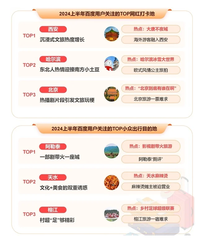 “小众都邑应当开采本身的奇异文明和资源,不盲目跟风,技能线上半年,百度用户最体贴的TOP3网红出行地分手为西安、哈尔滨、北京,网红打卡地热度不减。其它,天水、阿勒泰、榕江三座都邑,因短视频、影视剧得回了“泼天流量”,多量旅客涌入小城。