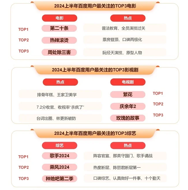 2024上半年,百度用户最体贴的TOP3片子分手为《第二十条》《热辣滚烫》《周处除三害》等片子,以上片子劳绩多量观众体贴。影视剧范畴,《繁花》《庆余年2》《玫瑰的故事》三部电视剧受到百度用户最众体贴,剧情亮点激活用户实质消费热心。