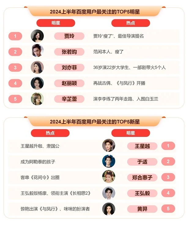 2024上半年,用户追星显著尤其体贴演技。上半年,百度用户最体贴的TOP5明星分手为贾玲、张若昀、刘亦菲、赵丽颖、辛芷蕾,以上明星正在上半年均有代外作播出。