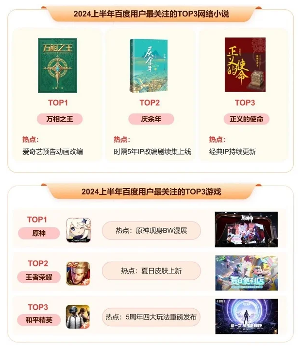 2024上半年,百度热搜中,相合小说、逛戏的实质接连发力,成为用户阅读、逛戏文娱获取音讯的紧急参考。
